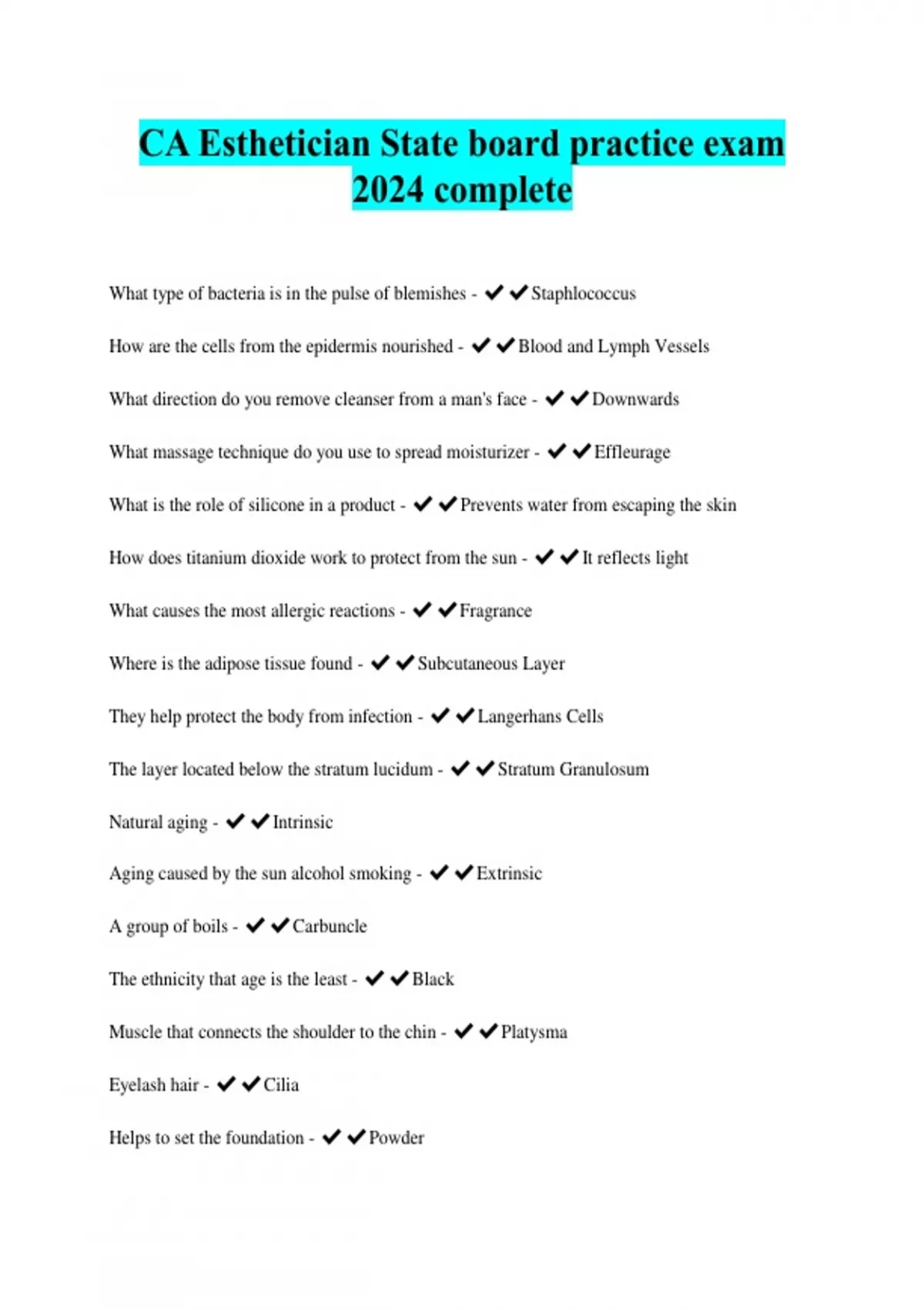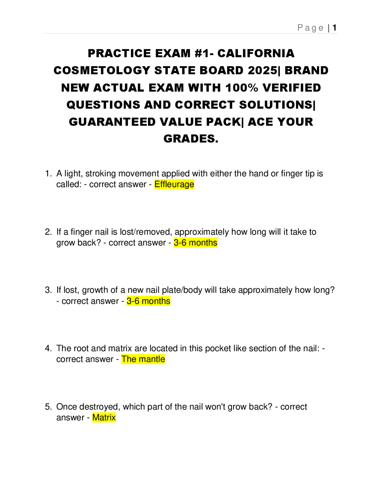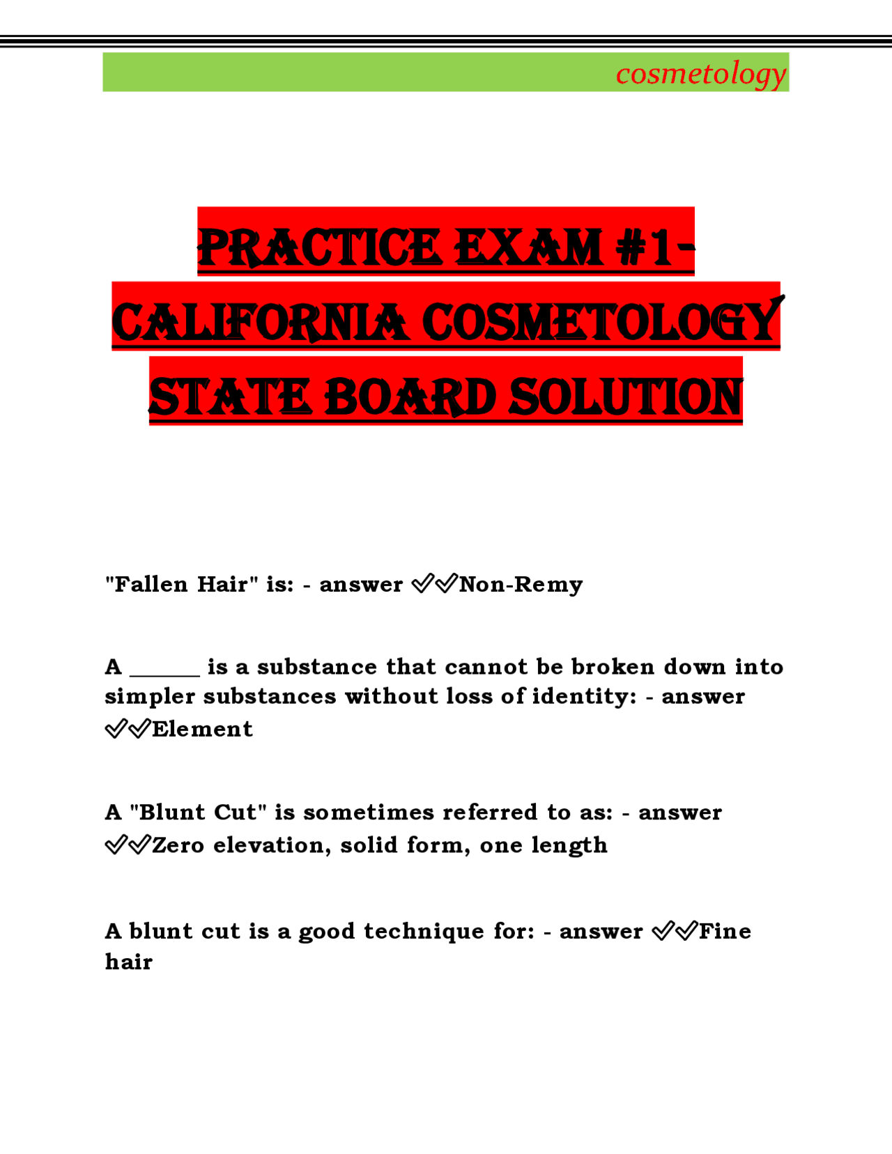 The California Cosmetology State Board Practice Exam assesses core knowledge in areas including hair cutting, coloring, cosmetology esthetics, safety protocols, and state-specific cosmetology regulations. Prepared by the State Board of Cosmetology, the exam combines written questions and practical skill assessment, requiring both technical precision and theoretical understanding. It reflects current industry standards and licensing expectations—making it the gold standard for starting a licensed career in California. The exam format promotes fairness, transparency, and consistent competency evaluation.