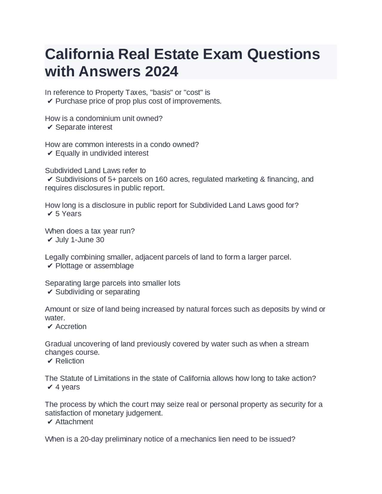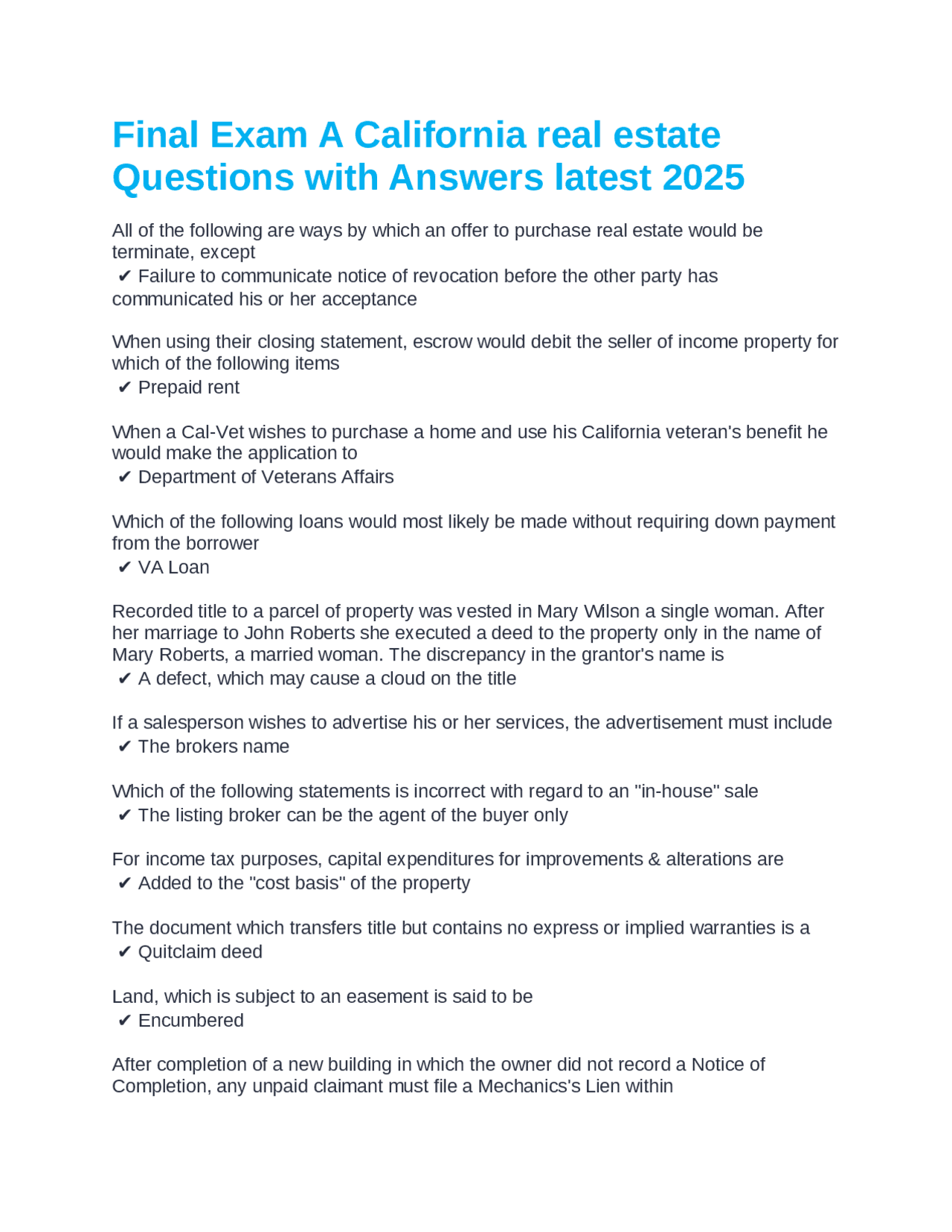 The California Real Estate Exam Questions Pdf is a comprehensive, updated compilation of official-style questions covering core topics in the state’s real estate landscape. These include zoning regulations, property valuation methods, contract law fundamentals, local market trends, tax implications, and compliance standards. Designed for clarity and relevance, the file avoids ambiguous wording and technical overload, making it accessible to learners at all stages—even those with limited prior experience. Each question is grounded in current state guidelines and recent legal updates, ensuring users study material that reflects real-world expectations.