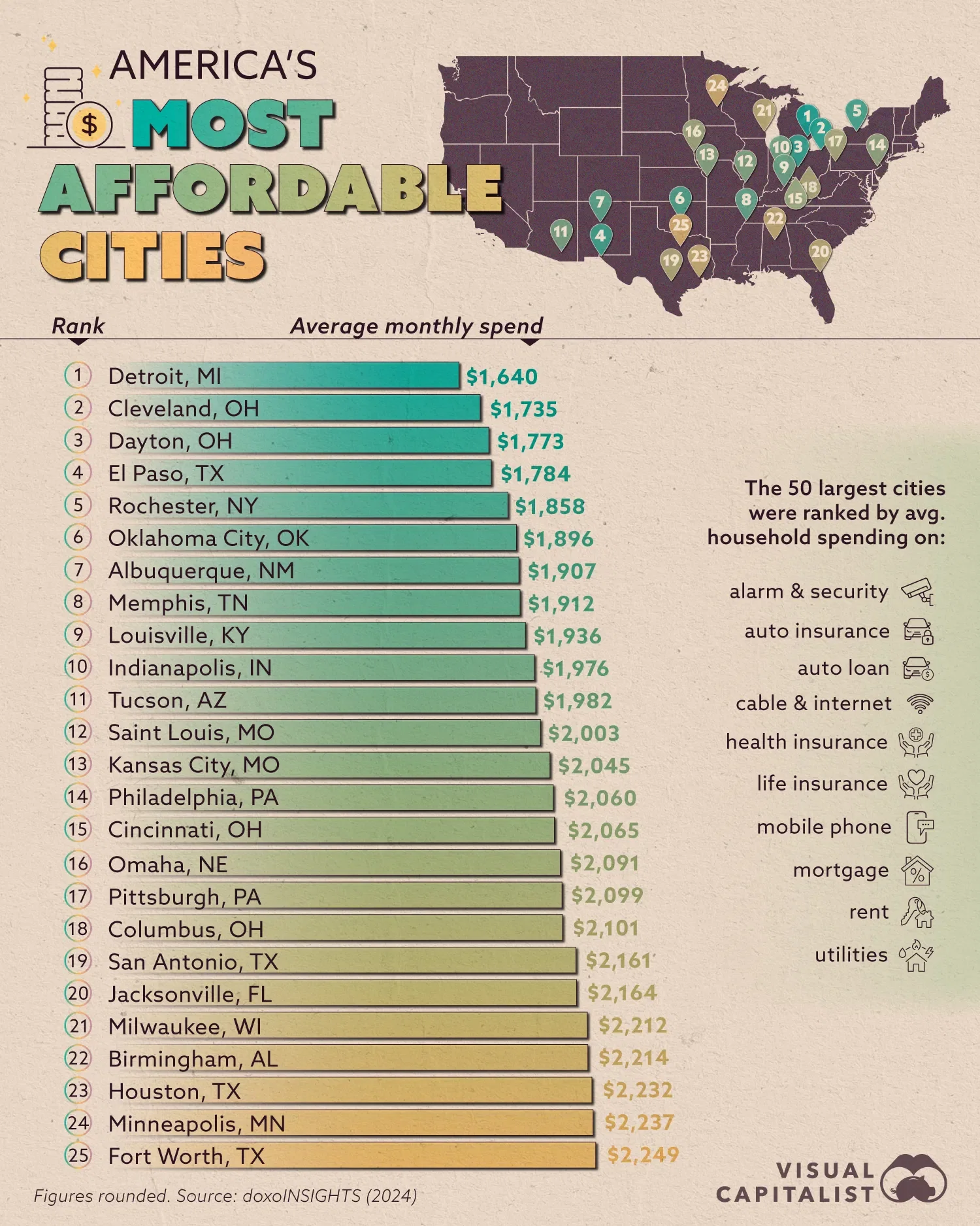 What counts as affordable here? Cost-of-living benchmarks vary, but cities in this spectrum typically offer median home prices under $500,000, monthly rent below $2,000 for a one-bedroom, and total housing expenses (including utilities and taxes) well below the national median—often under $2,500 monthly.